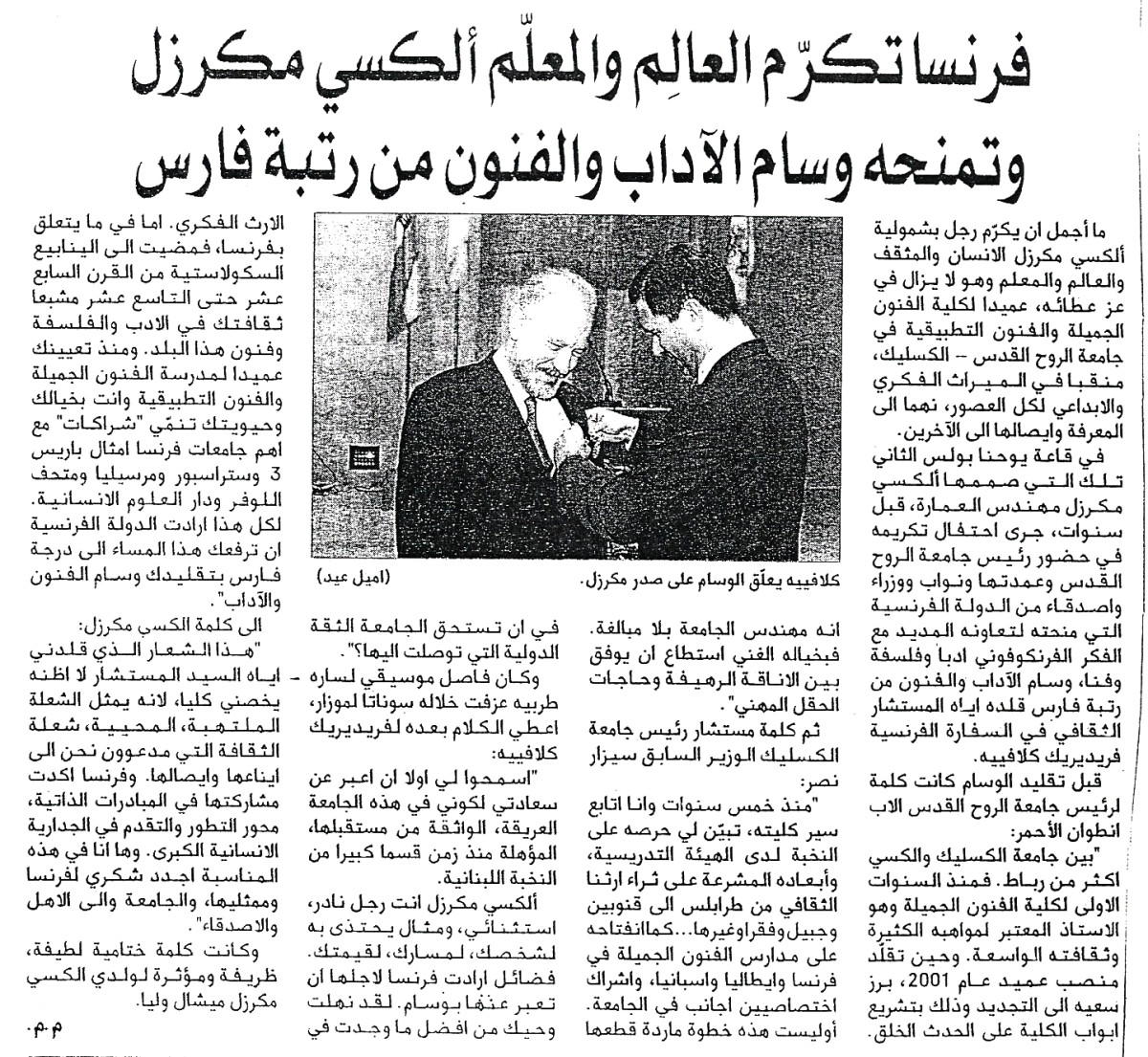فرنسا تكرّم العالم و المعلّم ألكسي مكرزل و تمنحه وسام الآداب و الفنون من رتبة فارس