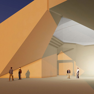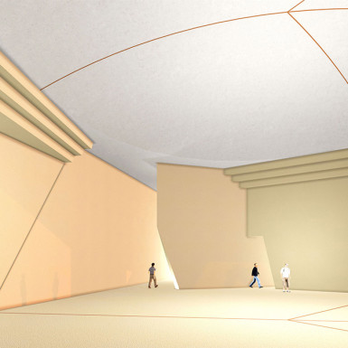 Seen from the cliff, the cultural centre seems generated by one drawn line, scaled to nature, inducing a discrete geometry in a linear modulation. Underneath it, the functional spaces are partly displayed in a semi troglodytic development. Their forms are innovative, thus unexpected, bearing in a symbolic way the meanings of the typologies of the patrimony of Afghanistan.