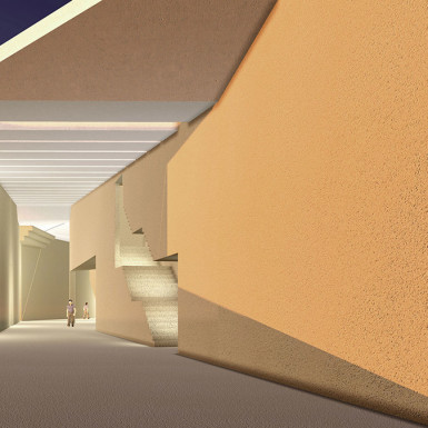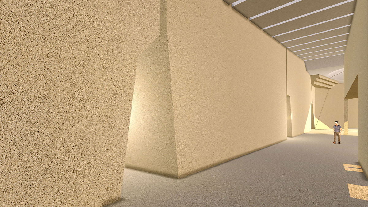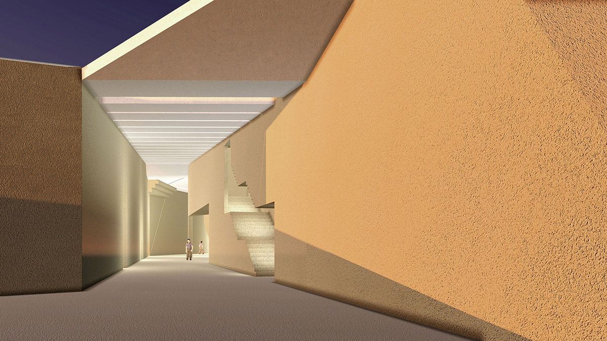 Unity is expressed by the processional visiting experience of the space, where various components merge in harmony all along the main gallery towards the dome, the Iwan, the view. The left wall of the gallery echoes the broken cliff, leading through troglodytic accesses to particular functions; whereas the stairs serving the classrooms in the first floor are carved in the right wall all along, as if synthesized from the archaic ones carved in the Buddha Cliff.