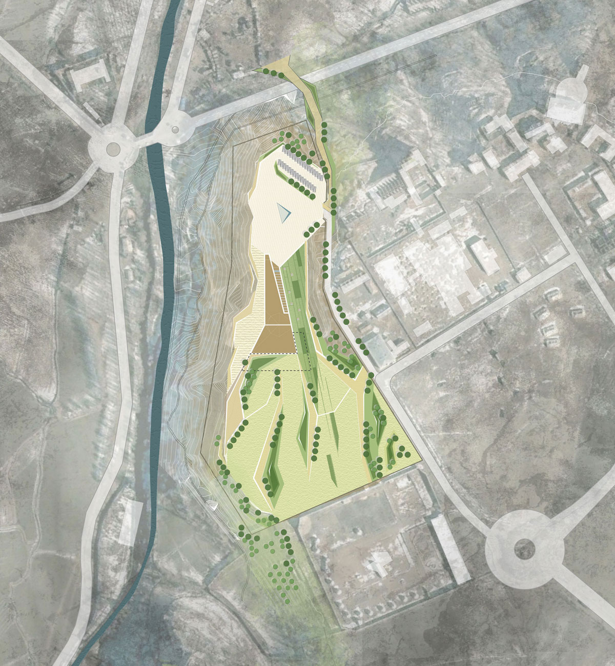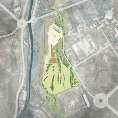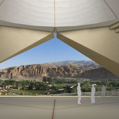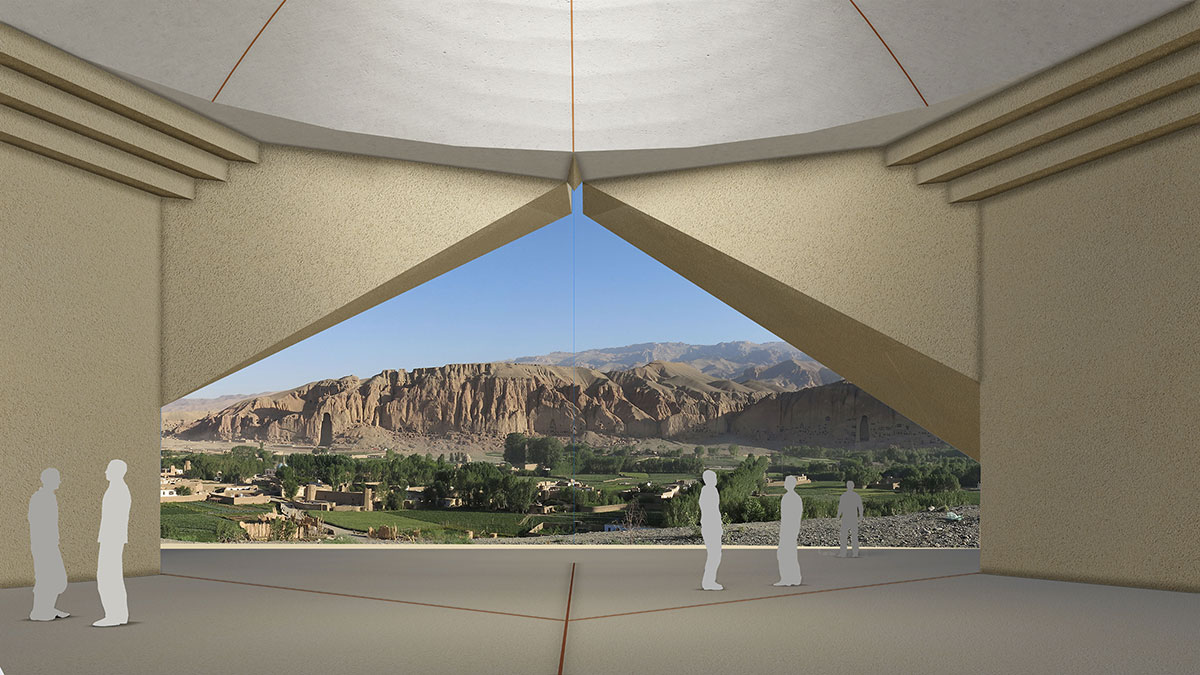 In front of the timeless authority of the Bamiyan Cliff, the proposed cultural centre blends with nature, expressing its identity in a simple but strong gesture that operates a deep cut on the shoulder of the hill (the delimited terrain), facing the historical cliff.