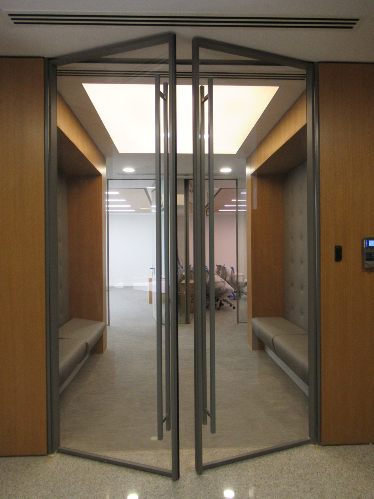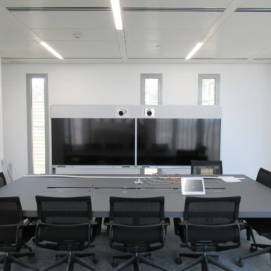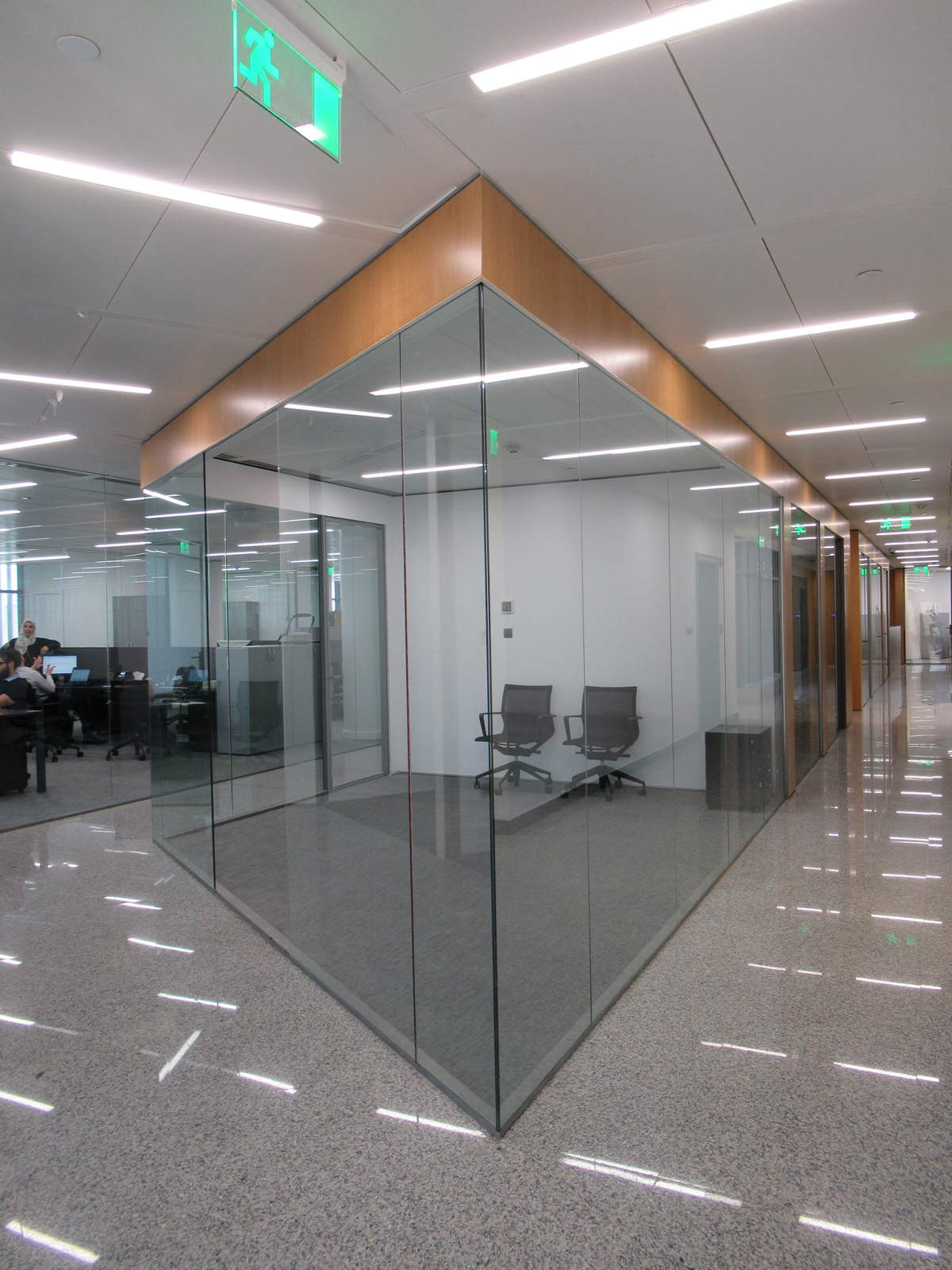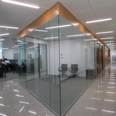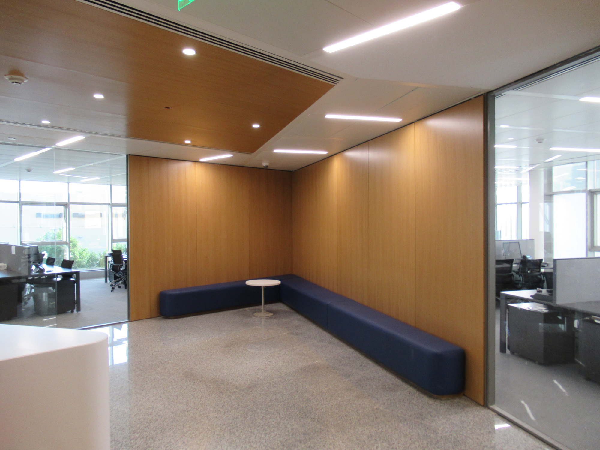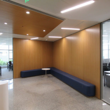 The main reception desks are drawn after the client logo in a bold movement of white corian, highlighted by a French oak wall and ceiling. The Data Center is placed on a fully glazed corner for clients to see while going to the boardroom. The offices are designed in grey tones for a high tech and corporate look. The ceiling metal panels are perforated for an enhanced soundproofing performance. The precisely calculated lighting distribution and fluid circulation allow this office to operate efficiently in a very pleasant environment.